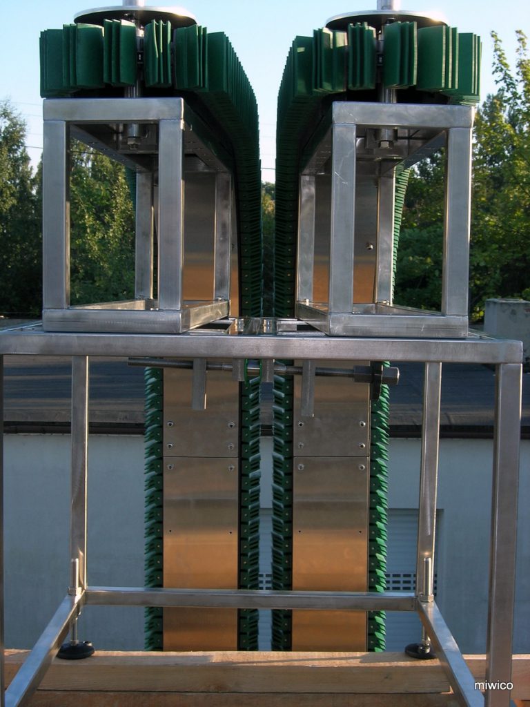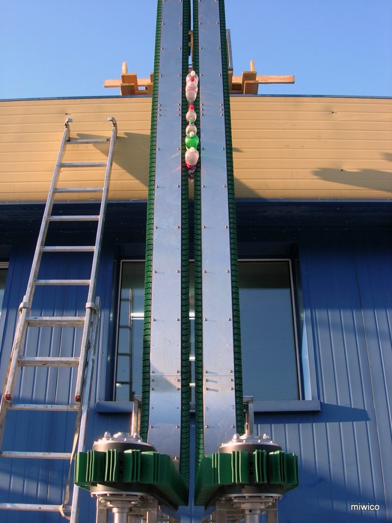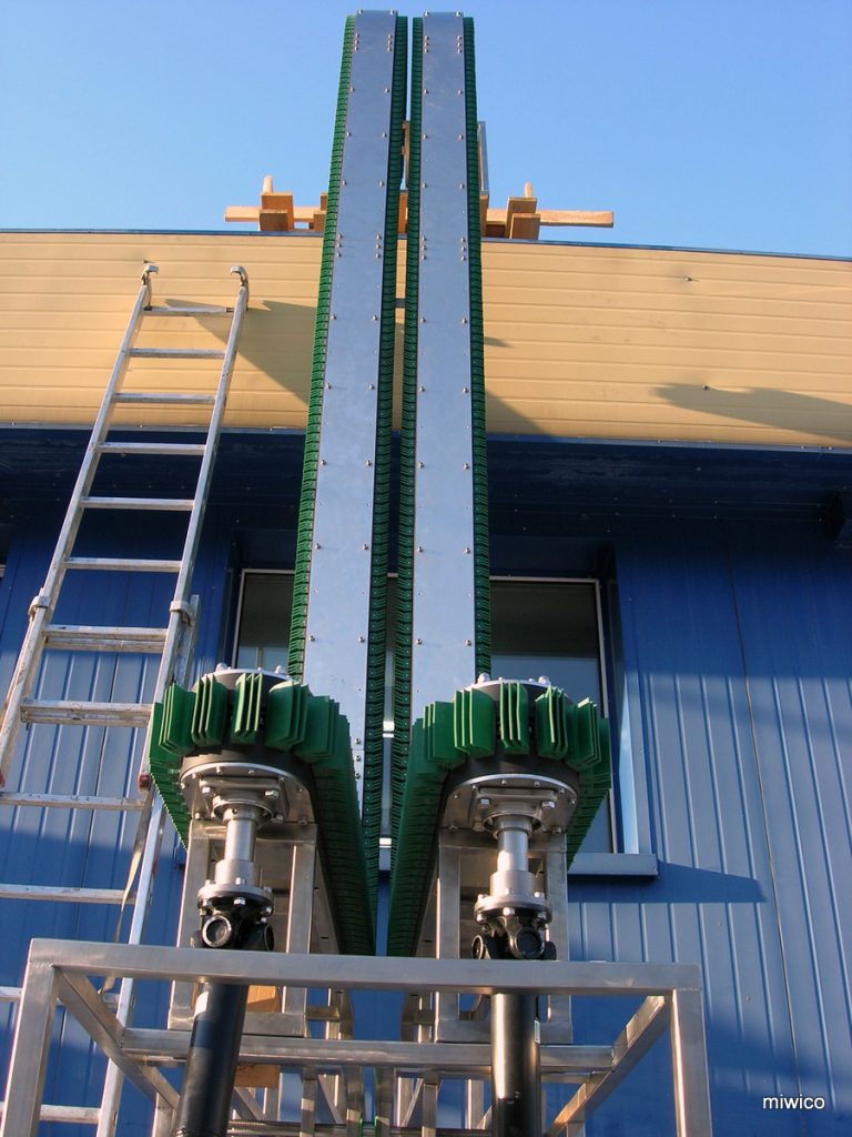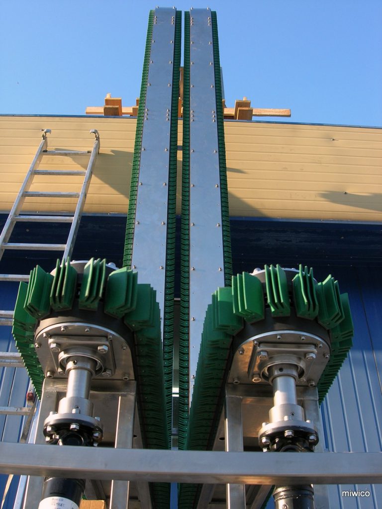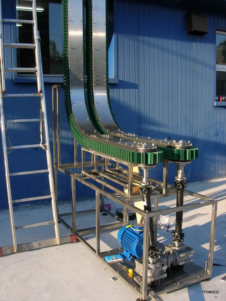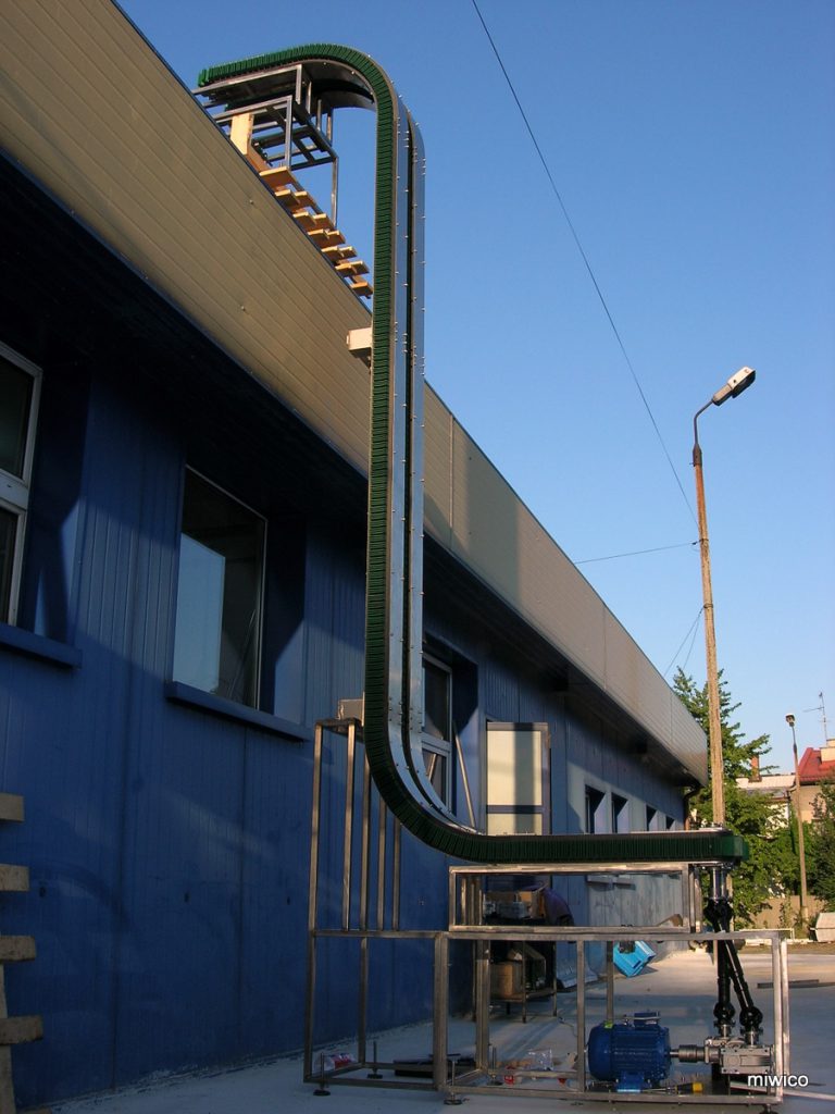 Przenośniki Pionowe Systemy transportu pionowego. W galerii poniżej przenośnik typu Omega, służący do podnoszenia butelek z napojami.