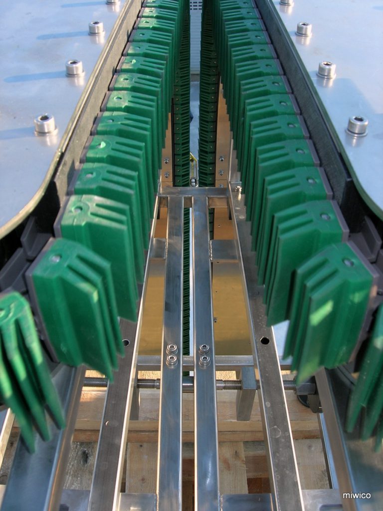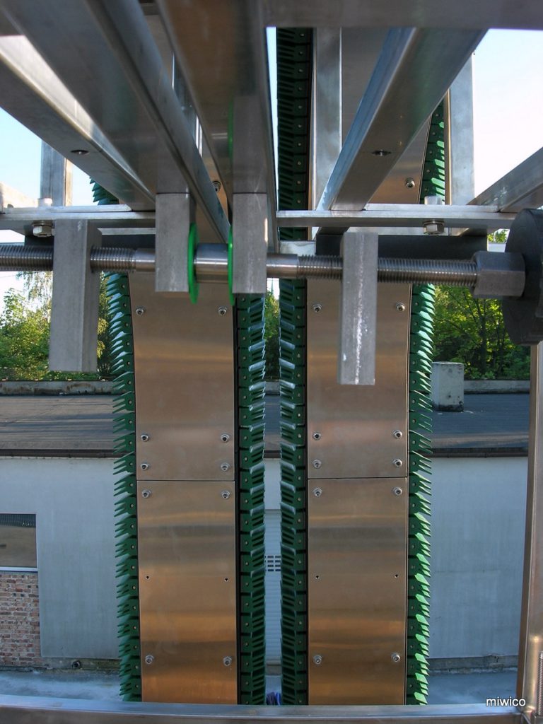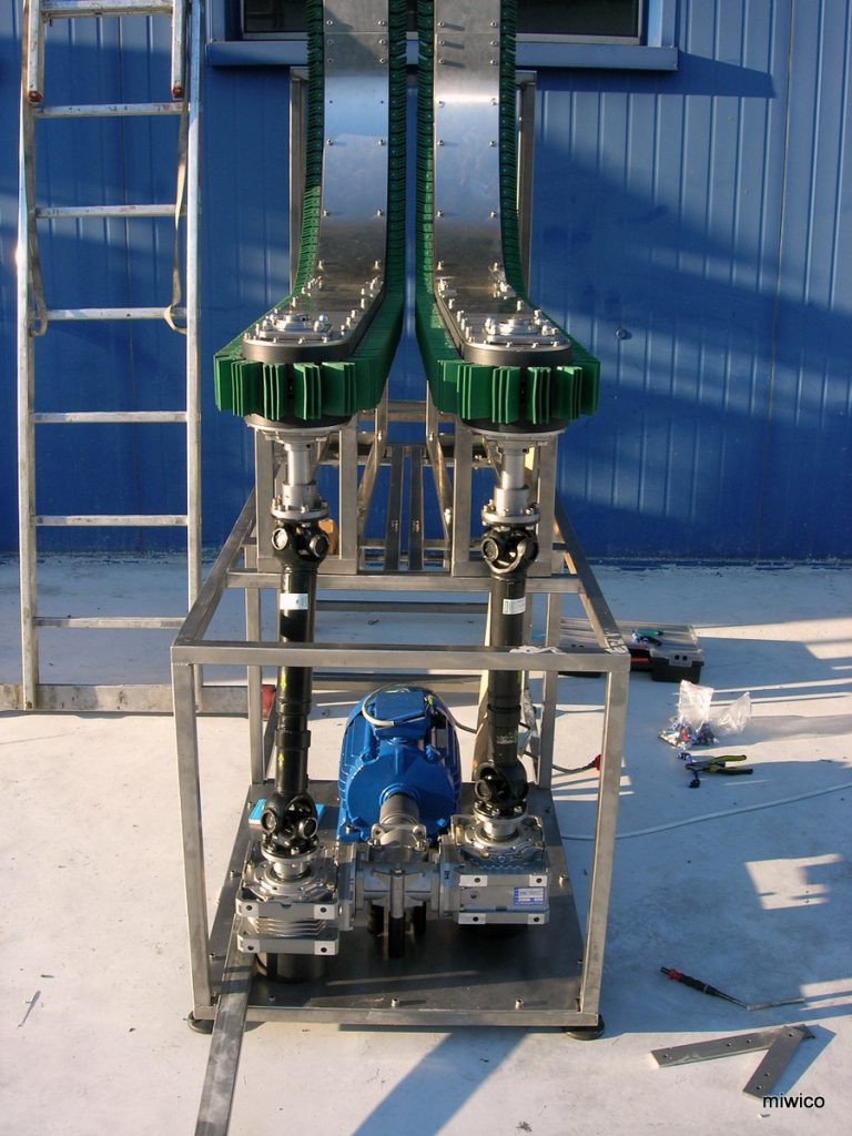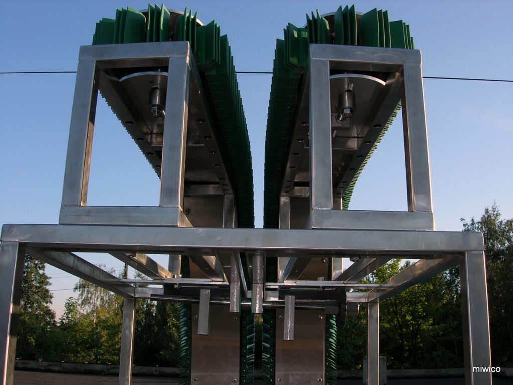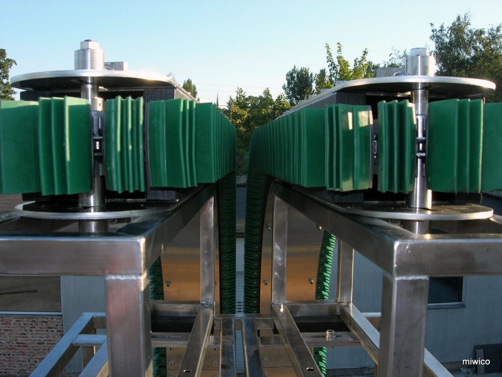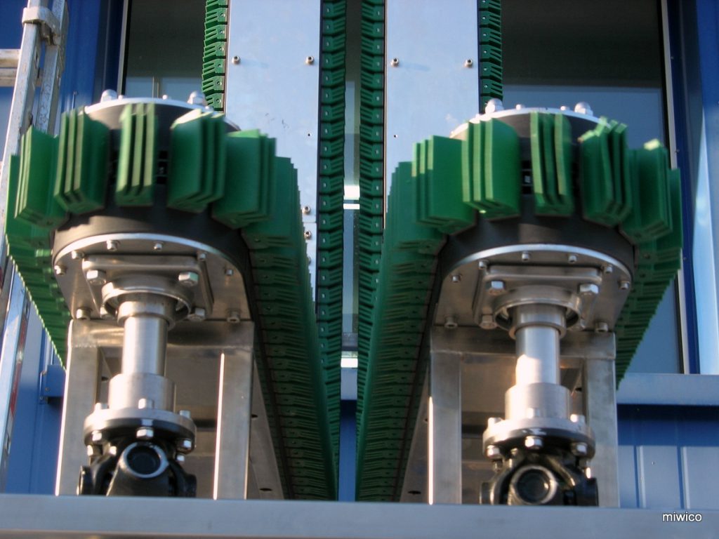 Przenośniki Pionowe Systemy transportu pionowego. W galerii poniżej przenośnik typu Omega, służący do podnoszenia butelek z napojami.